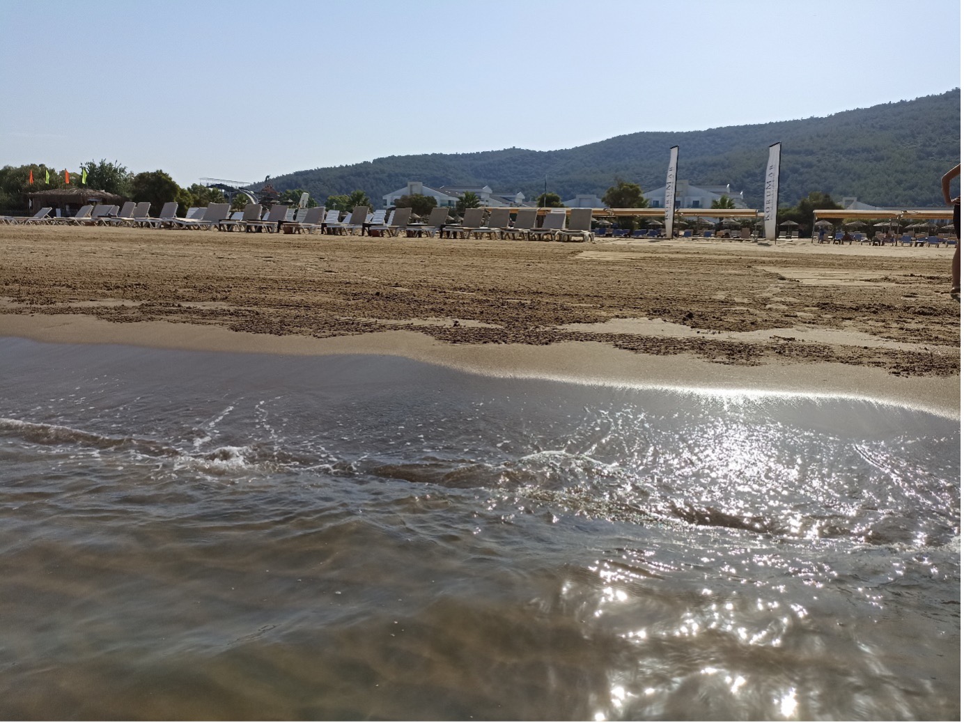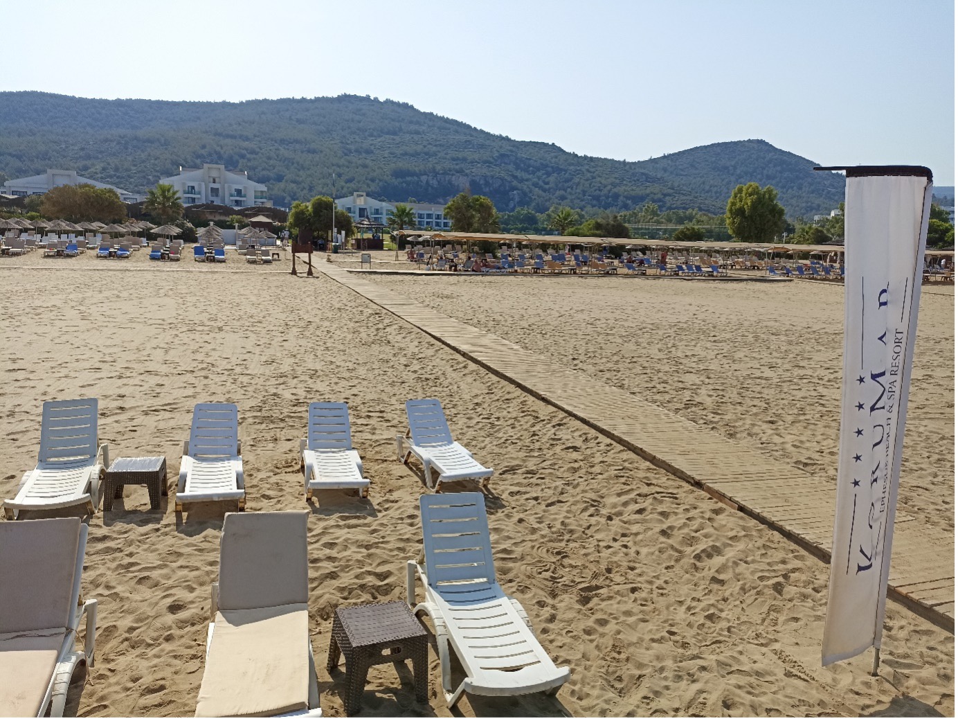 Plaja este lata si foarte curata, cu nisip fin si intrare lina in apa, perfecta pentru copii. Cateva zile apa a fost cam tulbure datorita nisipului atat de fin. Pe baza unei cartele ne luam in fiecare zi prosoape pentru plaja. La pranz, la intrarea pe plaja erai asteptat cu diverse fructe sau inghetata. Ziua, echipa de animatie organiza diverse jocuri pe plaja invitand turistii care nu aveau chef sa leneveasca la plaja. Intr-una dintre seri a fost organizata o petrece pe plaja, cu muzica live si diverse preparate culinare. Contra cost poti face diverse sporturi pe apa sau plimbari cu vaporasul.