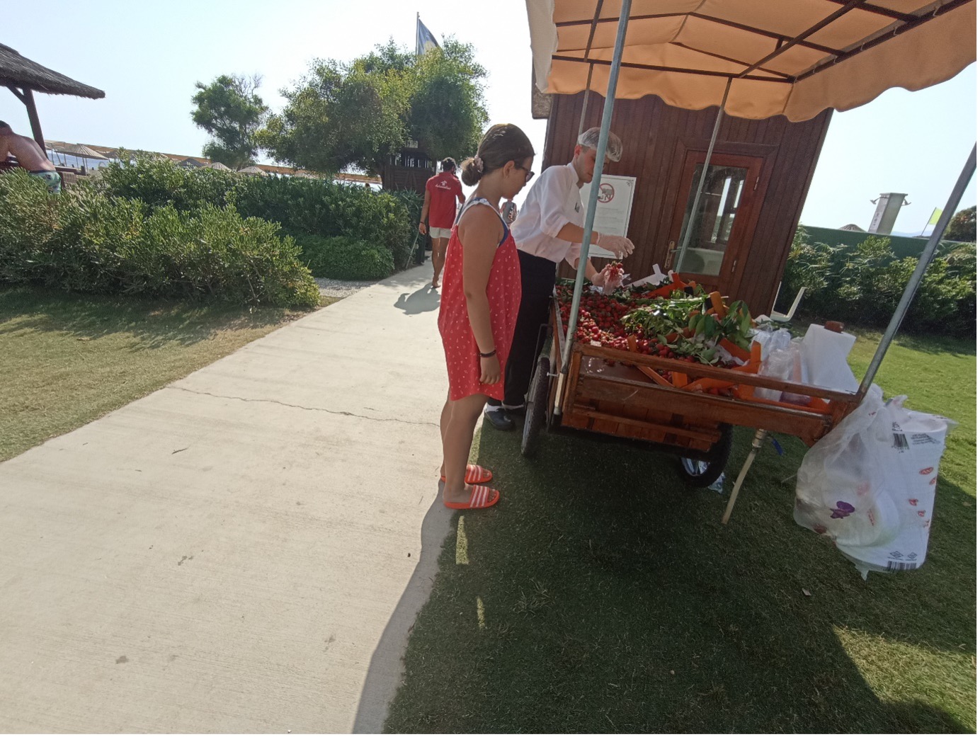 Mancarea si bautura. Foarte multa si variata. Mi-a placut ca aveau multe fructe atat in restaurantul principal cat si la snack. Resortul are regim de Ultra All Inclusive. Intre anumite ore se deschide cofetaria unde poti alege diverse sortimente de prajituri, inghetata, cafea iar aproape de plaja este un fel de bucatarie in aer liber asa numitul snack unde poti servi diverse preparate, fructe dar si placinte facute pe loc. La mesele principale au meniu special pentru copii sau pentru dieta. Mi-a placut ca aveau multe fructe atat in restaurantul principal cat si la snack. Am mancat cele mai bune capsuni si cirese.