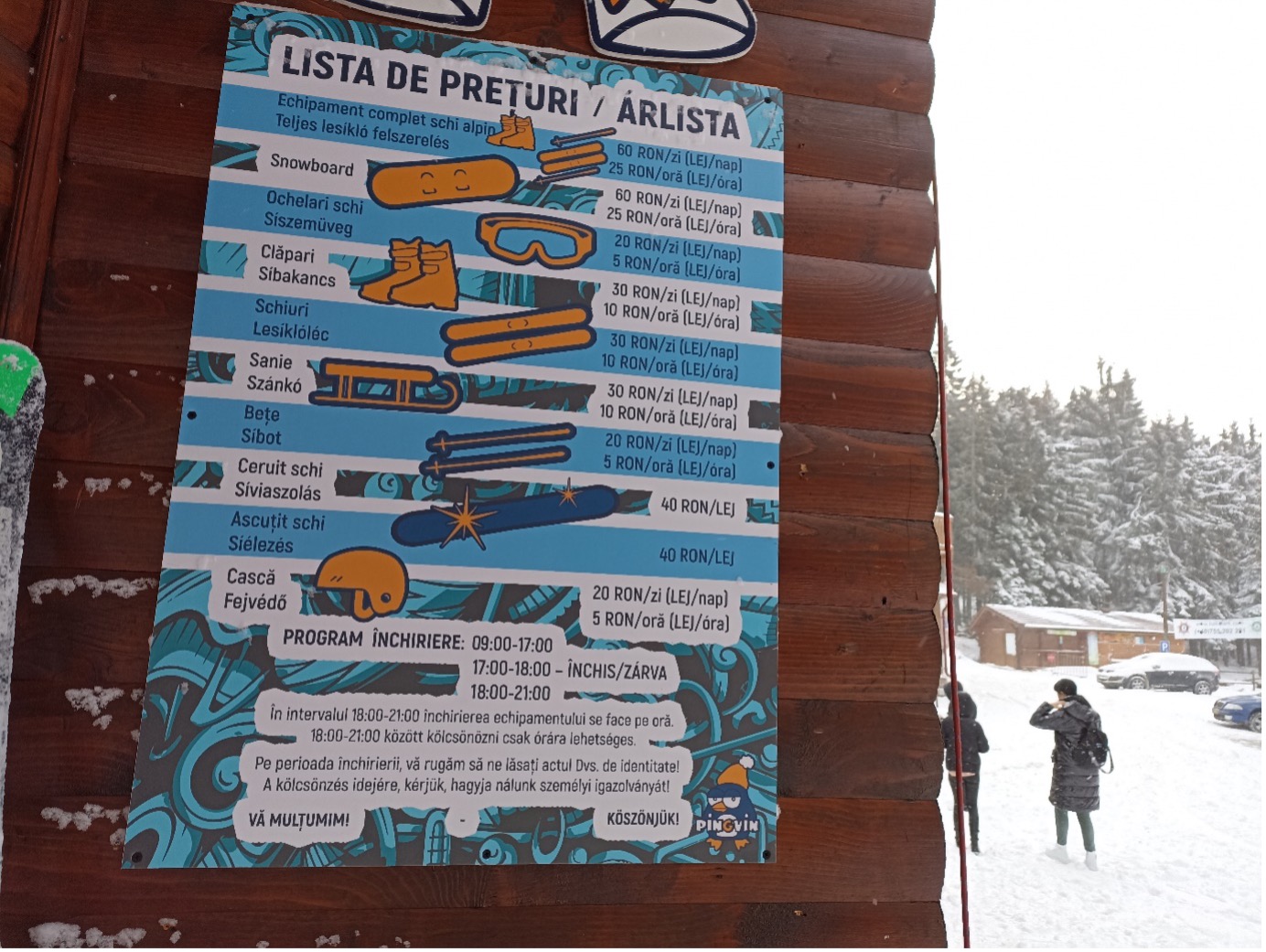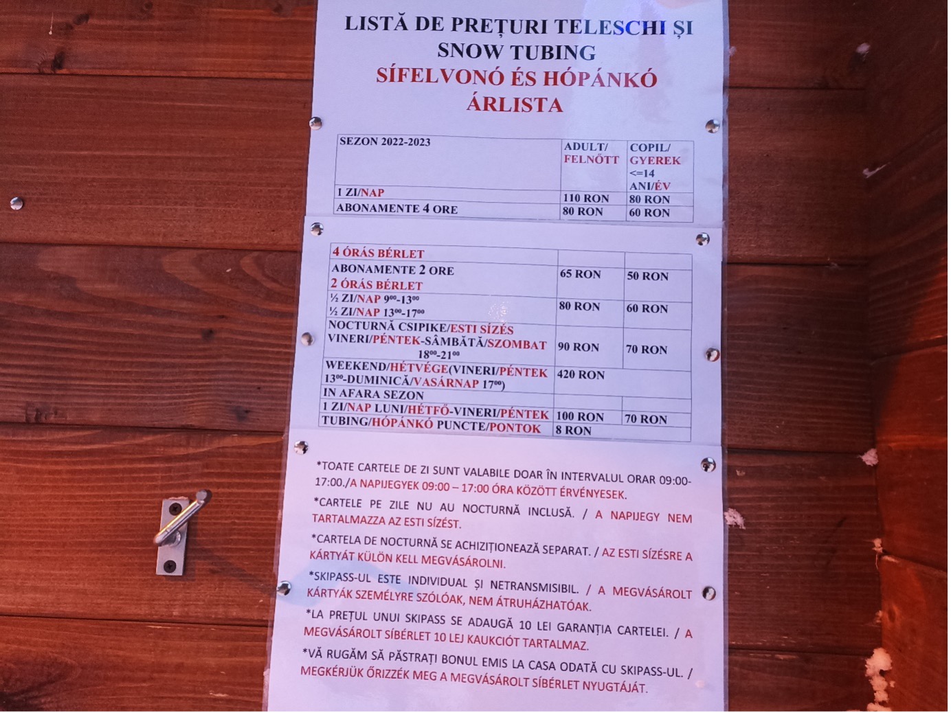 Pentru adulti, pretul unui skipass pentru o zi este de 110 RON, jumatate de zi 80 RON iar pentru 2 ore poti achita 65 RON. La copii preturile sunt putin mai mici (asa cum se vede in imaginea de mai jos).