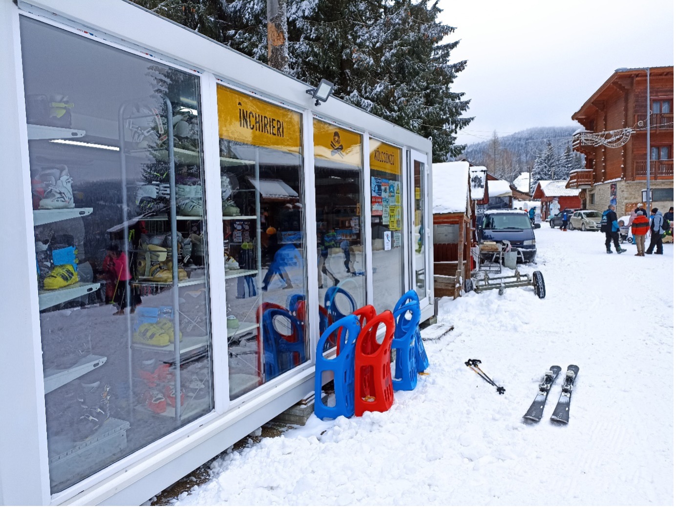 Pentru inchiriere echipamente de schi sunt mai multe centre. Intri, lasi buletinul, iti iei ce ai nevoie pentru una sau mai multe zile si platesti la sfarsit. Pentru o zi, un echipament complet costa in medie 60 RON.