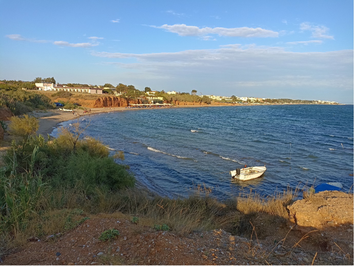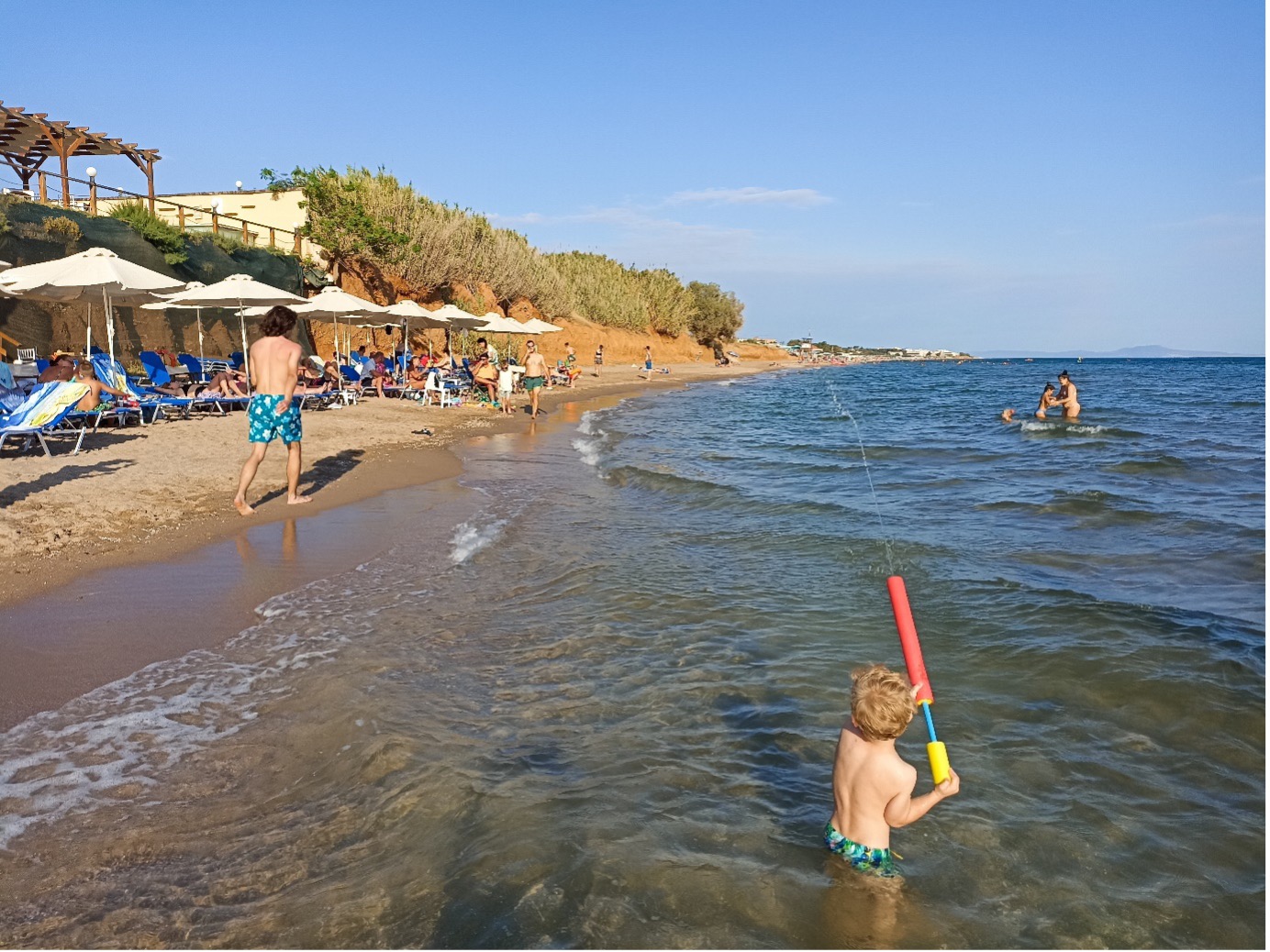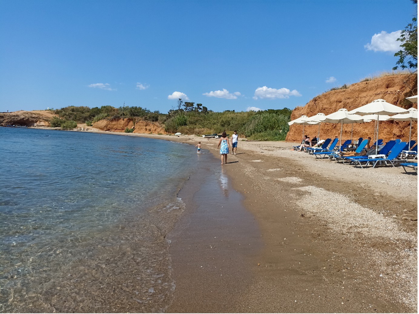 - Plaja publica la care se ajunge in 3 minute de la hotel. Este o fasie de plaja lunga de la Nea Chili pana spre EOT Beach. Din loc in loc sunt tersase. Noi ne-am oprit in fiecare zi la primele sezlonguri, plaja privata din fata hotelului Aphroditi Island Park, unde primesti un sezlong gratuit daca iti cumperi de la Island Beach Bar de exemplu o cafea sau un suc.
